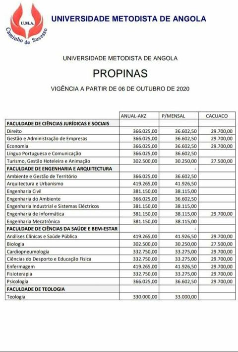 A Universidade Metodista de Angola (UMA), aumentou, até 10 % na cobrança de propinas por mês, em todos cursos, medida a vigorar a partir do reinício das aulas, previsto para Outubro próximo, informou aquela instituição de ensino nesta terça-feira, 22.